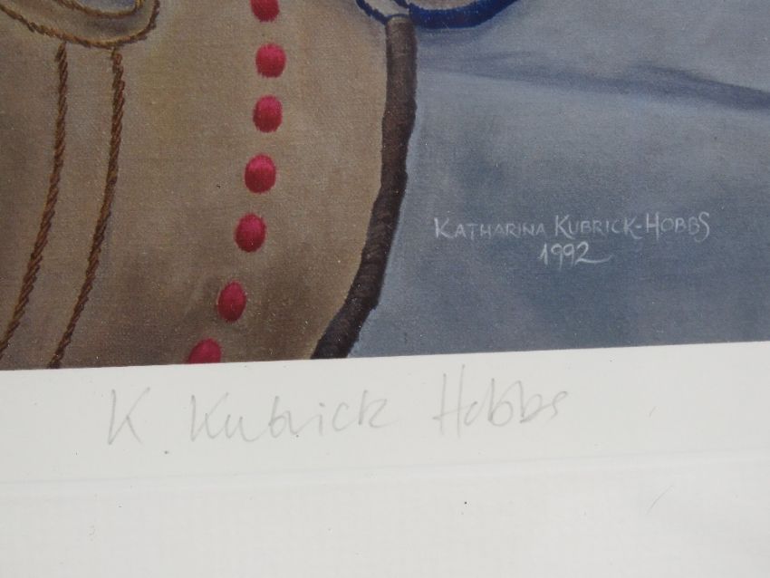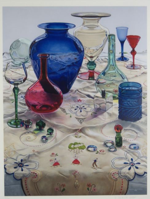 Katharina Kubrick Hobbs (1953), signed limited edition giclee print 33/100, Still life of glass from around the world on an ornate table cloth, 1992. Signed and numbered under in pencil, bears pamphlet from Gallery exhibition verso. Aperture 22 x 17" (55.8 x 43.2cm).Footnote: Katharina is the daughter of Christina Kubrick who was married to the filmmaker Stanley Kubrick.