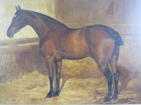Walter Harrowing (c.1838-1913) Equine School, oil on canvas, a fine portrait of a Bay horse within a stable, signed and dated '1887', 23 x 28" (58.4 x 71.1 cm). In a moulded rosewood frame with gilt slip.