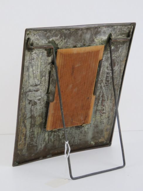Arts and Crafts: a 19 th century copper easel photograph frame with chased decoration depicting poppies with an oval aperture to centre, the whole 11 1/2 x 9 5/8" (29.2 x 24.4cm), aperture 5 x 3 3/4" (12.7 x 9 1/2 cm).