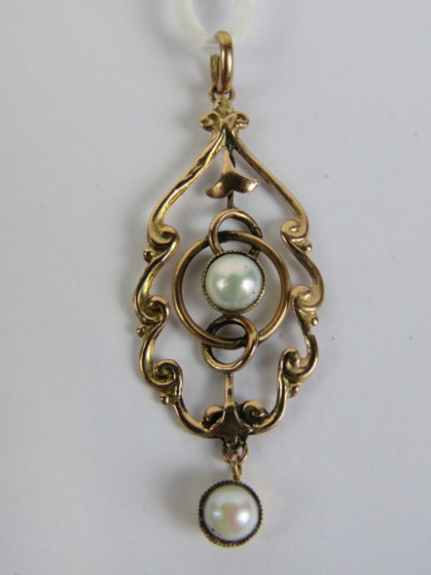 A 9ct gold and pearl Edwardian pendant having scroll work design frame, stamped 9ct (slightly worn), 4.7cm in length, 1.8g.