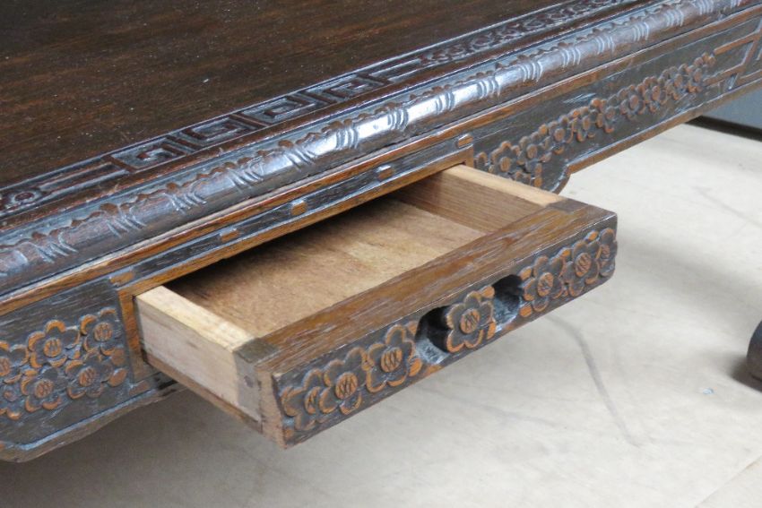 An Oriental hardwood low tea table having single drawer, part carved design upon with inswept legs, 102 x 45cm.