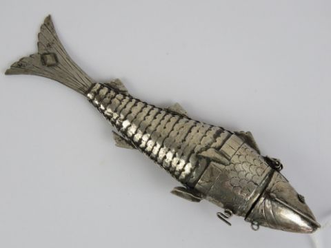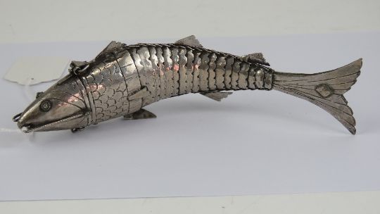 An Indian white metal articulated fish attar-dan, Bengal, probably Monghyr, late 19th century, the head opening to reveal compartment, having stylised face, scales to body, articulated body and flared tail fin, 18cm in length, 89g.
