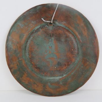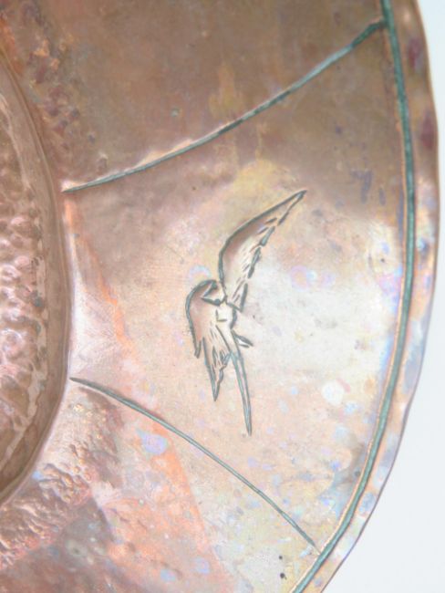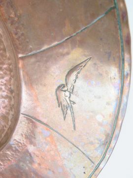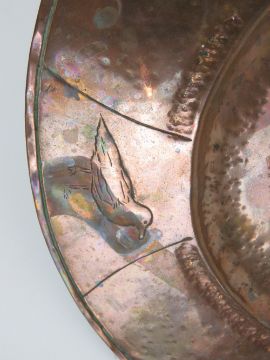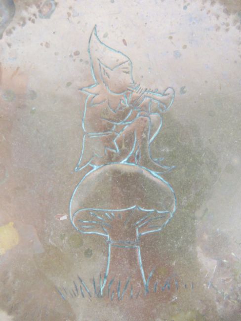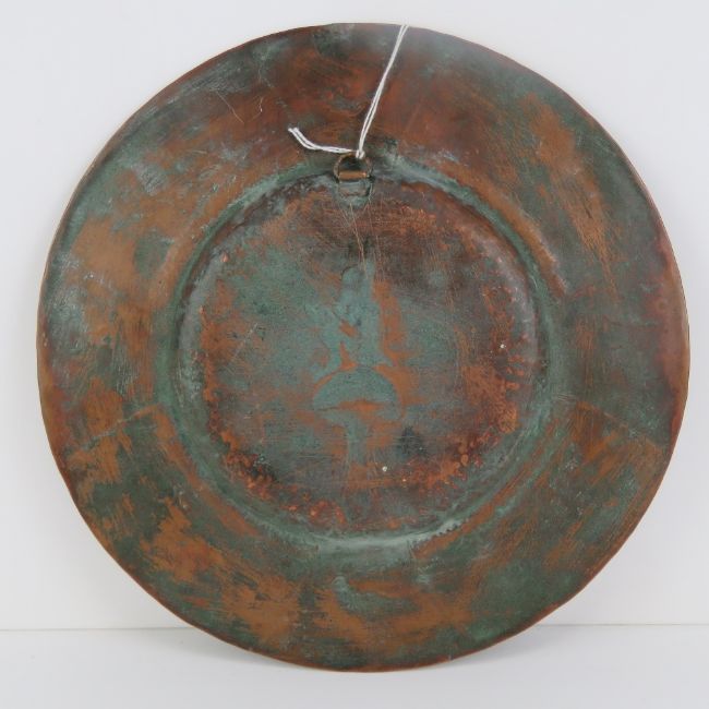 Cornish Beaten Copper: a charger with a Cornish Pixie sitting on a toadstool playing a trumpet horn , the outer edge decorated with seagulls, 10 1/3" (26cm) diameter.