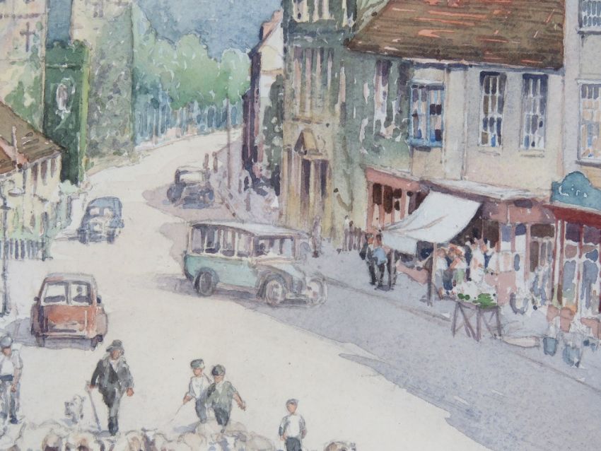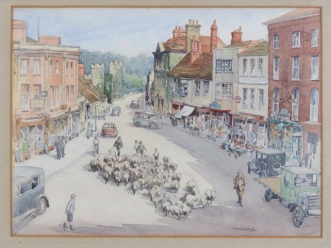 Frank Brown, 20th century watercolour, driving sheep through 'Buckingham High St. from Town Hall'. Signed lower right, titled verso. 16 x 20 1/2" ( 40.7 x 52.1cm). In a modern British frame.