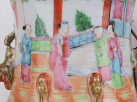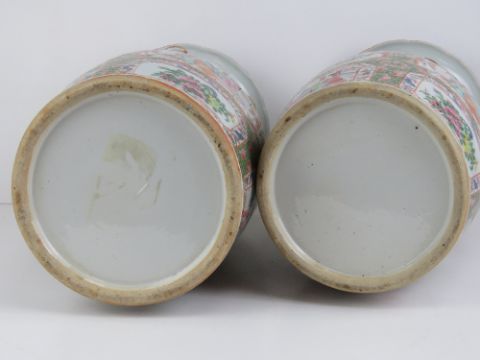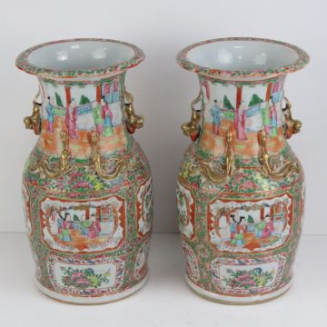 A pair of late 19th century Canton vases having figural scenes upon with gildd mythical creatures, each standing 35.5cm high.