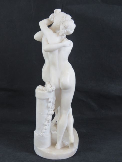 A 19 thC Grand Tour Neoclassical white (carrera?) marble sculpture of the mythological 'Three Graces', depicting the three female figures (daughters of the Greek God Zeus) after Antonio Canova, 15 3/4" (40cm) high. a/f.