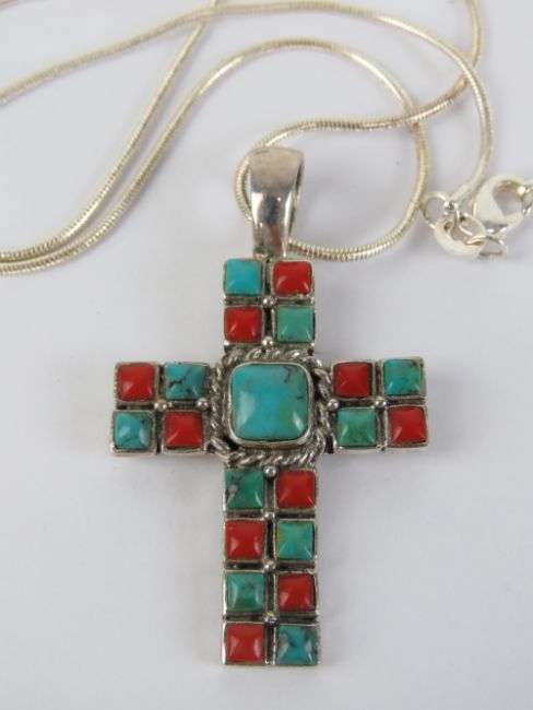A silver crucifix set with faux coral and turquoise, stamped 925, on silver chain, 4.6cm inc bale.