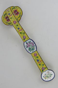 A Chinese Canton enamel on brass ruyi sceptre having deity and floral design upon yellow ground, 35cm in length.