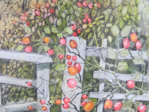 Gladys Elsie Crook (1916- 2011), watercolour, 'Kings Ash, Bucks' autumn with rose hips bordering a flint and feather board building on a lane. Signed lower right and titled with label verso, 11 1/2 x 17 3/4"(29.3 x 45cm). Framed but needs re-mounting.