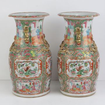A pair of late 19th century Canton vases having figural scenes upon with gildd mythical creatures, each standing 35.5cm high.