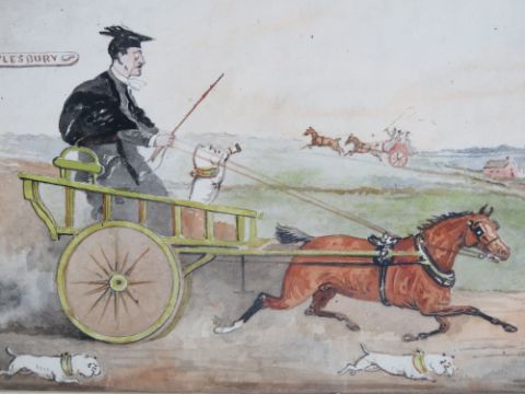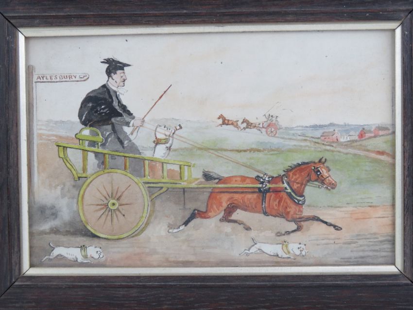 A c1900 English School watercolour, 'To Aylesbury' a school master drives a pony and cart at speed towards Aylesbury together with 3 dogs whilst a tandem horses and trap goes the other way. In an oak frame of the period with gilt slip, 6 1/2" (16.5cm) x 10 1/4"(26 cm).