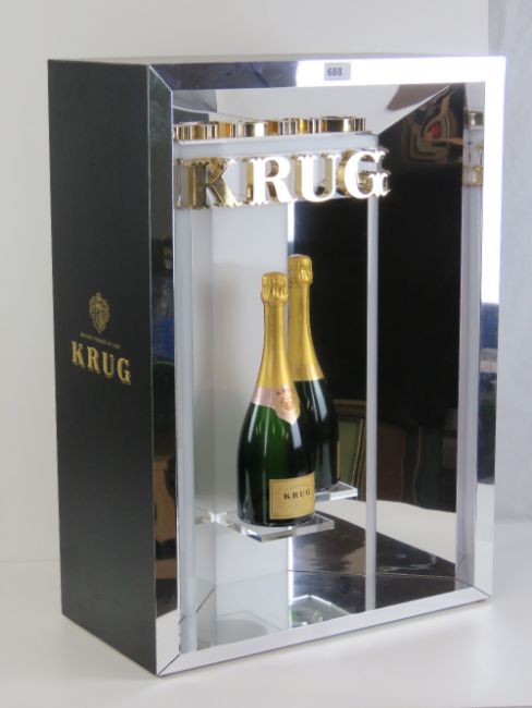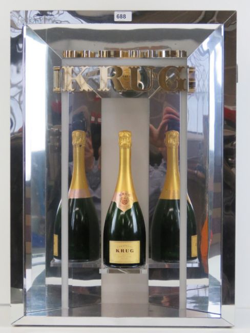 A contemporary illuminated Krug champagne bar display complete with Krug Brut Grant Cuvee display bottle (empty), wired for electricity, mirrored cabinet measuring 71 x 50 x 26cm.