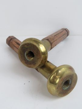 Two original brass and oak beer pump handles from The Old Red Lion Public House Litchborough, 30cm high.