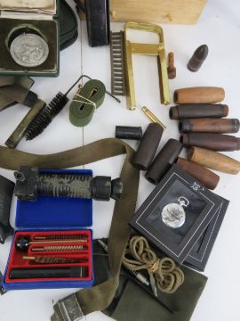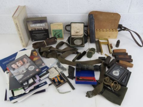 A quantity of assorted items including; casings, clips, link, medals, cleaning kits, pouches, slings, carry handles, bipod, mag loader, magazine, DVDs, books, etc.