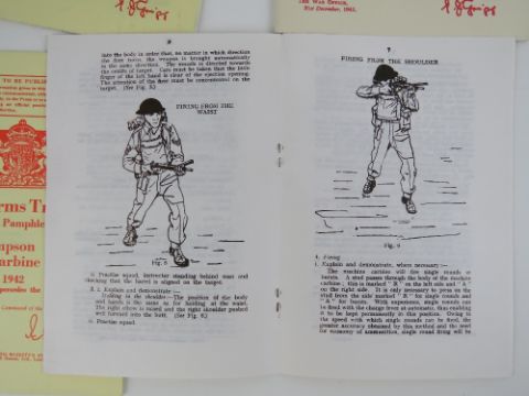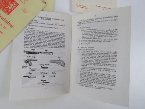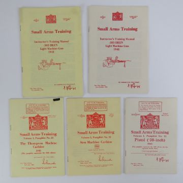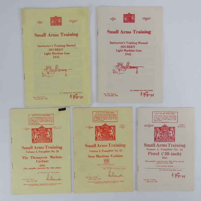 Five small arms training books; .38" pistol 1941, Sten machine gun 1942, Thompson 1942, and Bren 1941 (x2).