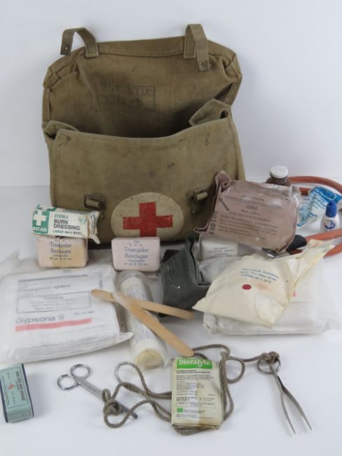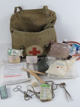 A WWII British First Aid Kit having canvas case and equipment, dated 1942.