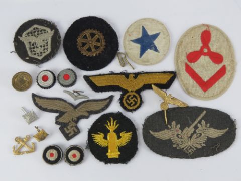A quantity of assorted military cloth patches with two cockade badges, pin badge, etc.