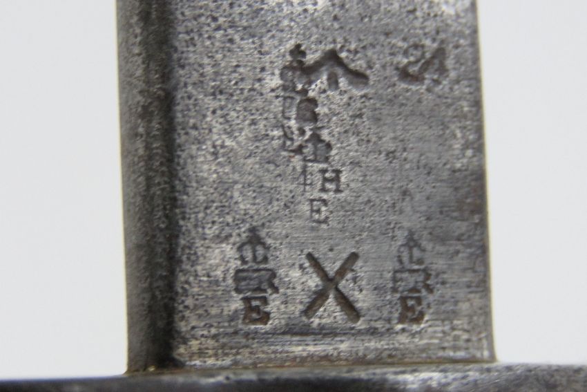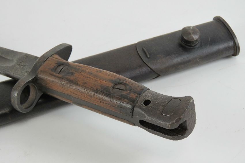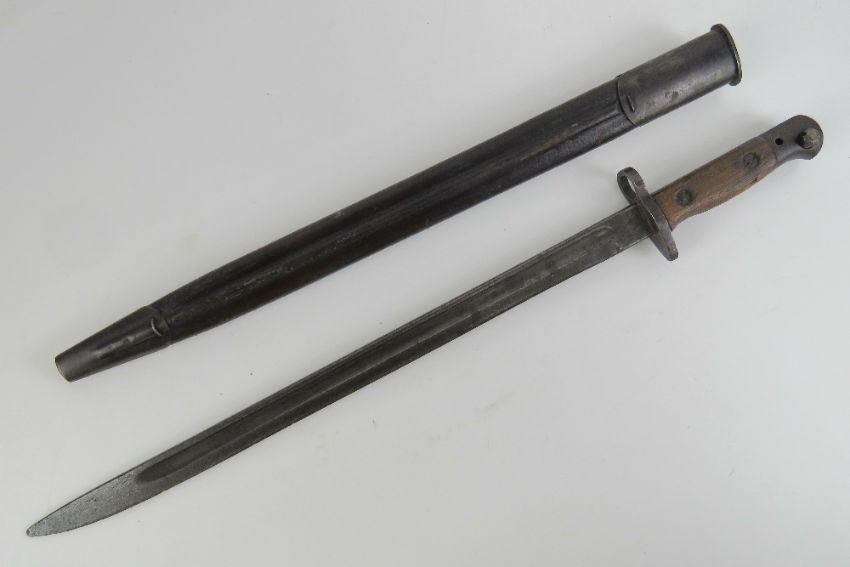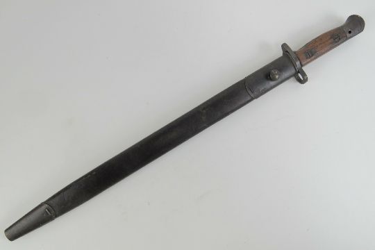 A WWI British 1907 pattern 1917 SMLE bayonet marked Chapman to 42cm blade with inspection marks upon, with leather scabbard.