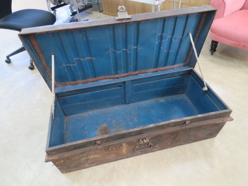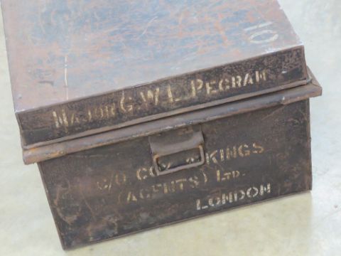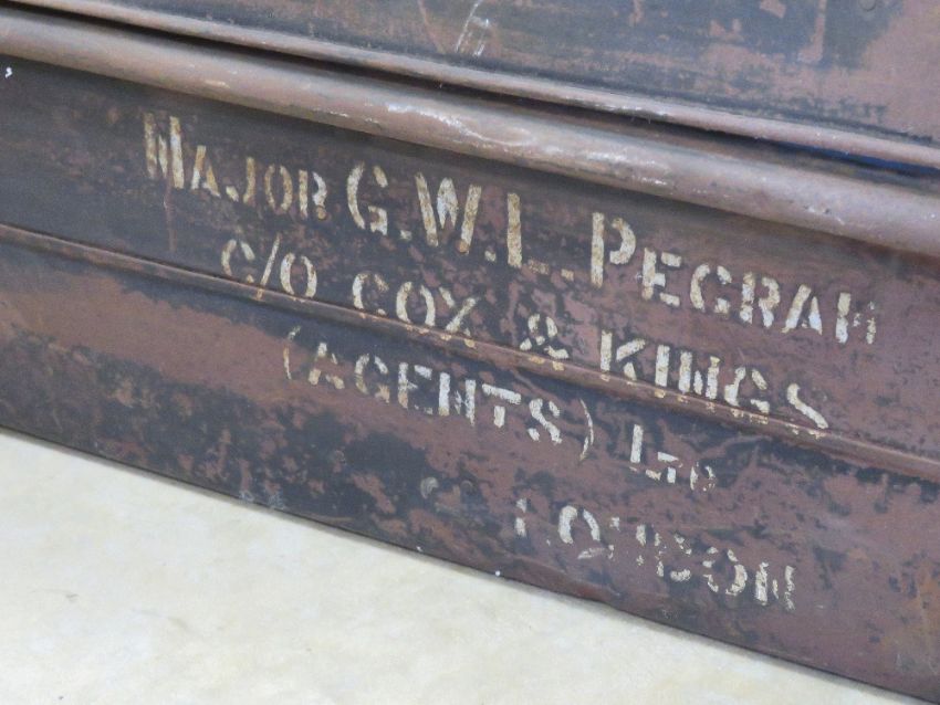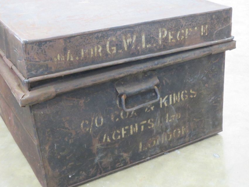 A WWII British Officer's footlocker chest with stencilling 'C/O Cox & Kings London'.