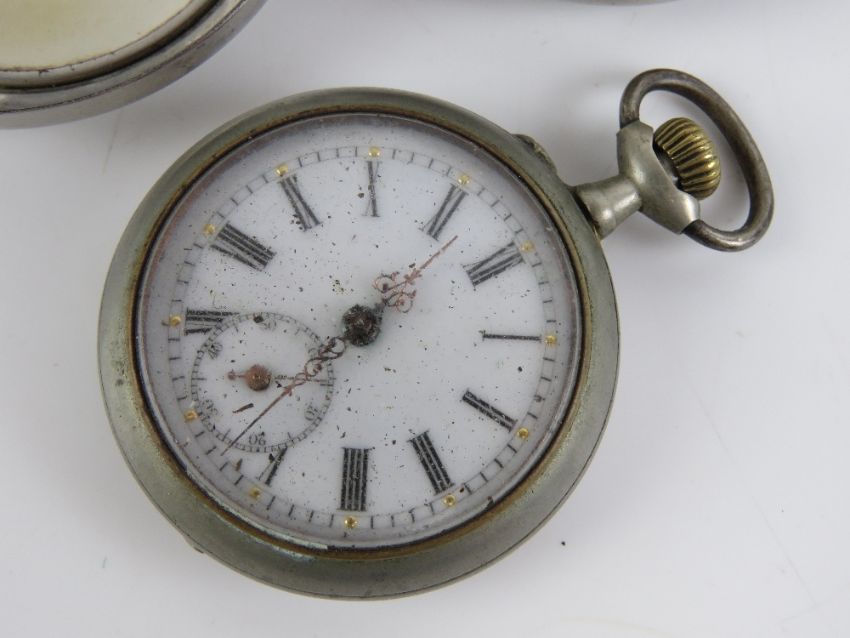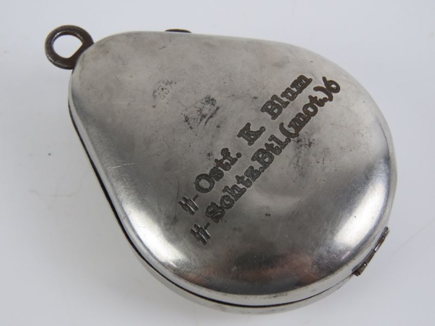 A vintage pocket watch having white enamel dial and rose metal hands, case back and protective case each engraved 'SS Ostf. K. Blum. SS Schtz. Btl. (mot.) 6'.