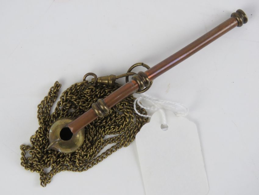 A copper and brass Bosons whistle on guard chain.