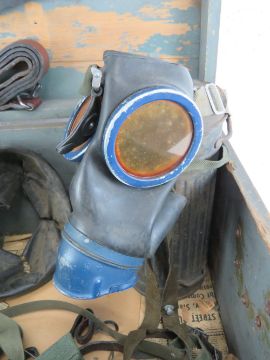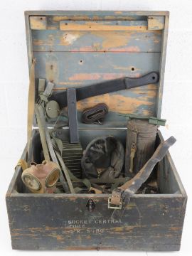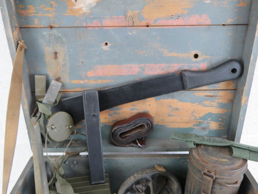 A quantity of assorted ephemera including; WWII era wooden transit case, German gas mask in tin, French gas mask, machete, helmet straps, gun slings, magazine, Law 66 end caps, etc.