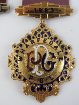 The Royal Antediluvian Order of Buffaloes (RAOB); A 1944 PGP blue enamel badge with GLE ribbon, together with another dated 1983 having Wharfedale PGL jewel made by Parry Birmingham upon, also a KOM jewel medal by Parry Birmingham, with ribbon, for Prince Regent Lodge No16 dated 1976-81. Three items.
