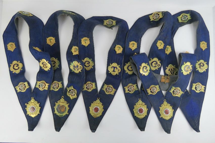 The Royal Antediluvian Order of Buffaloes (RAOB); six collars being C.R, W.P, C.MA, C.TY, C.CO, and C.CH for Leominster Lodge No6229, made by F.C. Parry Birmingham. With additional loose badge.