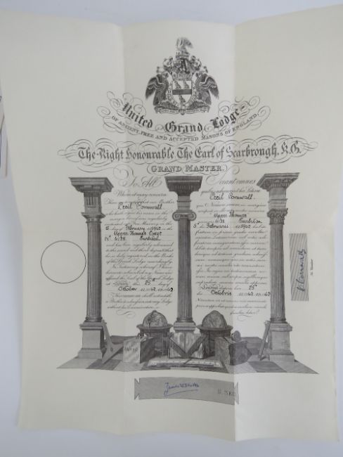 Masonic; A United Grand Lodge Initiation certificate for Cecil Cornwall dated 1962 for the Upper Tens Lodge No 6138, together with various Masonic booklets including Royal Arc Mariner Ritual No 1, Abercorn Lodge Bylaws, Grand Lodge Constitutions 1917, United Grand Lodge Constitutions 1926 & 1979 etc.