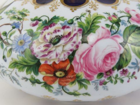 A delightful overlaid glass decanter of bulbous form, handpainted with birds, roses, peonies, etc, profusely gilded throughout, overlaid on faceted Bristol blue glass, c1850s, complete with stopper all standing 31cm high. With Insurance Valuation for £1200 (1999). Sold in aid of Air Ambulance.