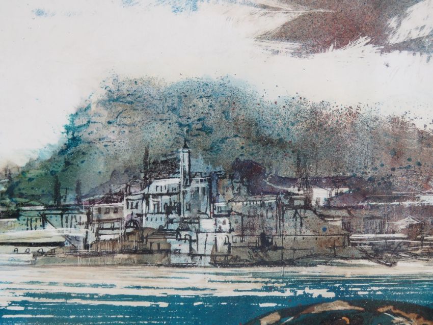 John Cort (late 20th century) mixed media, pen ink, watercolour etc, a French inlet, signed (back of brush) lower right, glass a/f, measuring 13 x 17 1/4" (33 x 43.8cm).