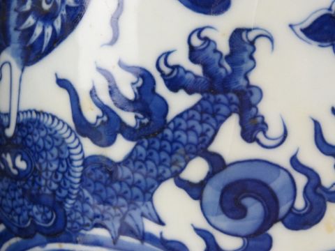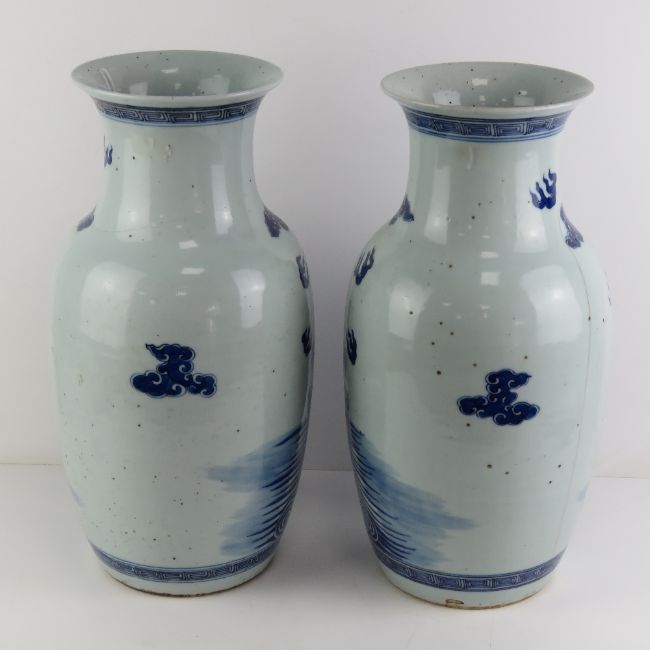 A pair of oversize blue and white Chinese shoulder vases having mythical beast design upon, each standing 46cm high.