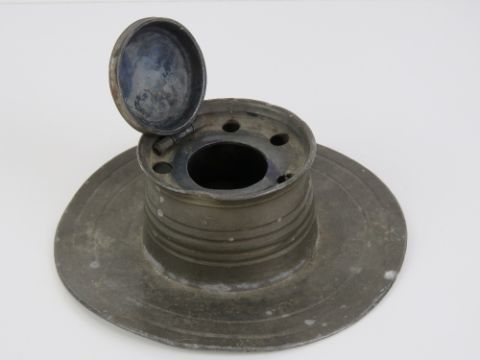 An Arts and crafts pewter inkwell of capstan form, with hinged lid and five quill / pen rest holes, 6” (15.2 cm) diameter.