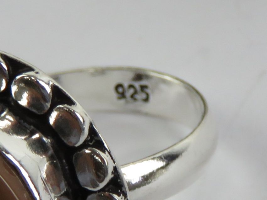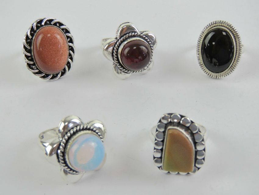 Five hardstone rings each stamped 925, size M-N, including gold stone and onyx.