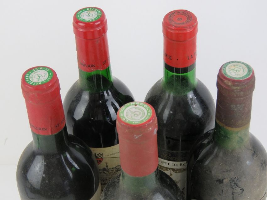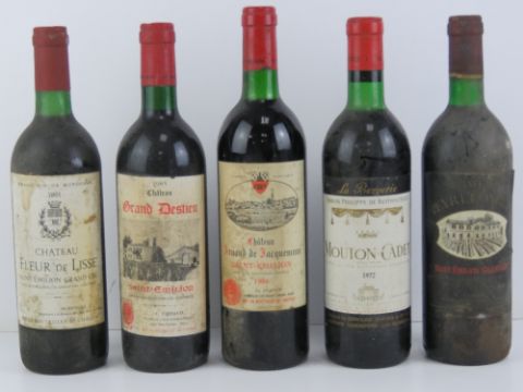 Wine; four bottles of St Emillion; chateau Fluer d lisse 1981, chateua grad destie 1985, chatea pulgue 1985, and chataue arnanud de jacquemeau 1986. Together with a bottle of baron Pillipe de Roschild mouton cadet 1972.