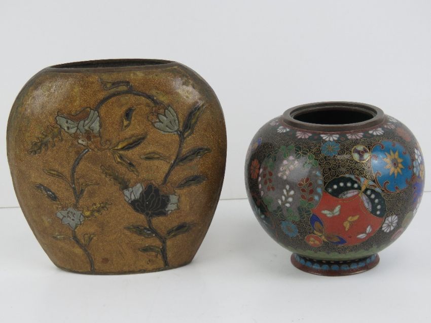 A heavy Oriental cast brass flask vase decorated with flowers in relief on a burnished gold ground, together with a spherical 20th century cloisonné vase. Two items.
