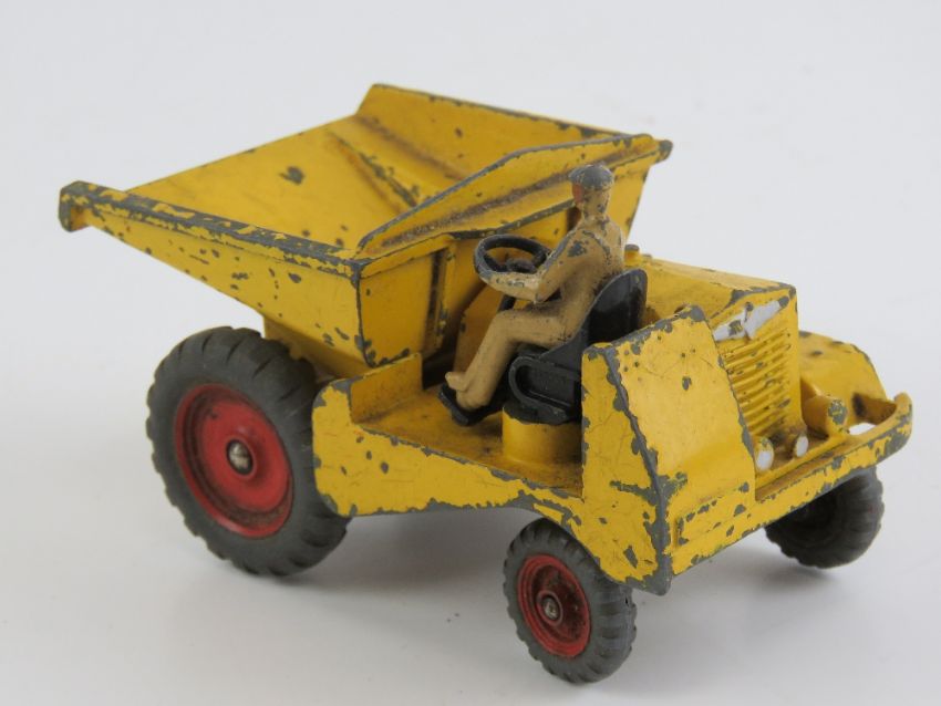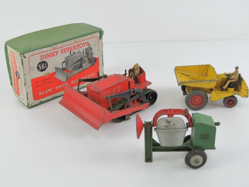 A Dinky Super Toys Blaw Knox Bulldozer in original box (bottom of box deficient. Together with a Dinky Super Toys Muir-hill Dumper Truck and a cement mixer. Two items.