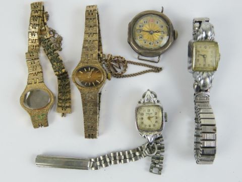 A 925 silver ladies watch head, a/f, a Verity ladies stainless steel watch, a Rotary ladies watch and two others a/f. Five items.