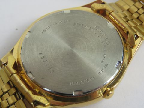 A gold plated Seiko with day and date aperture, yellow metal hands and batons, with original Seiko strap.