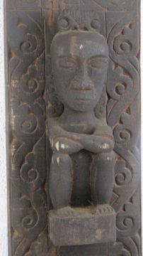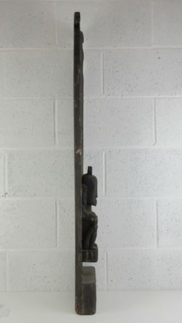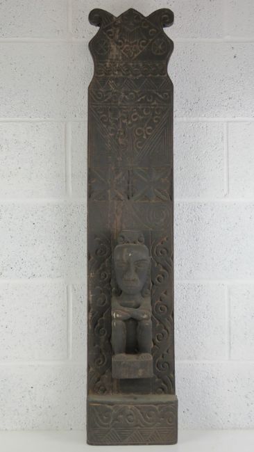 African Wall Art; a part carved and shaped wall piece having geometric design and figure upon, 116cm high.