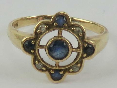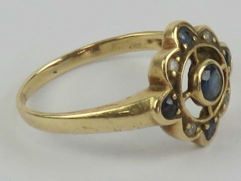 A 9ct gold sapphire and diamond ring, central round cut sapphire with gallery of sapphires and diamonds surrounding,stamped 375, size R-S, 3.1g. Together with a Pia ladies wristwatch. Two items. Sold in aid of Air Ambulance.