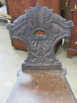 A stained oak single hall chair in Carolean revival style having pierced and carved back and opposing barleytwist legs, slightly a/f to back.