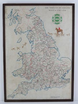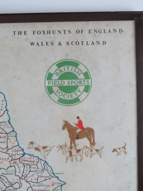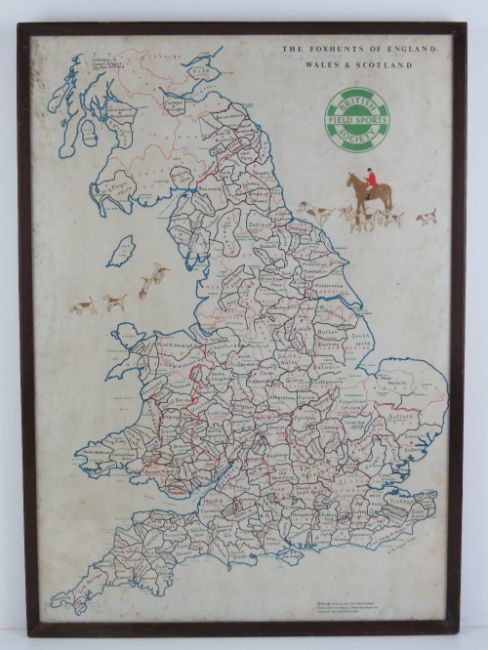 British Field Sports Society; a coloured rare map print 'The Foxhunts of England, Wales & Scotland'. Framed 24 3/4 x 17 1/2" ( 62.8 x 44.5 cm).