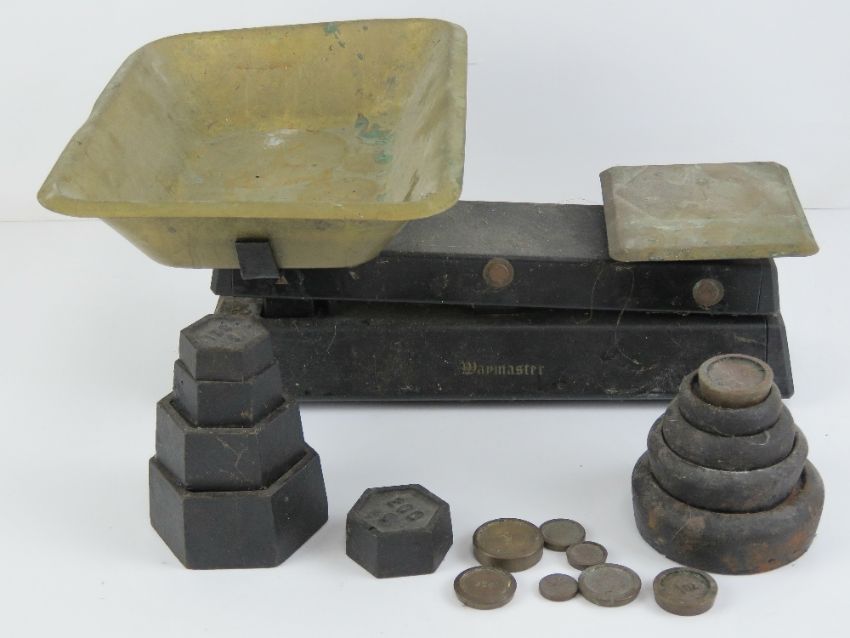 A Waymaster set of kitchen scales complete with brass pan, having assorted cast iron weights.