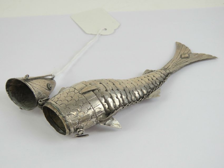 An Indian white metal articulated fish attar-dan, Bengal, probably Monghyr, late 19th century, the head opening to reveal compartment, having stylised face, scales to body, articulated body and flared tail fin, 18cm in length, 89g.