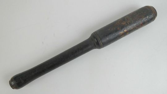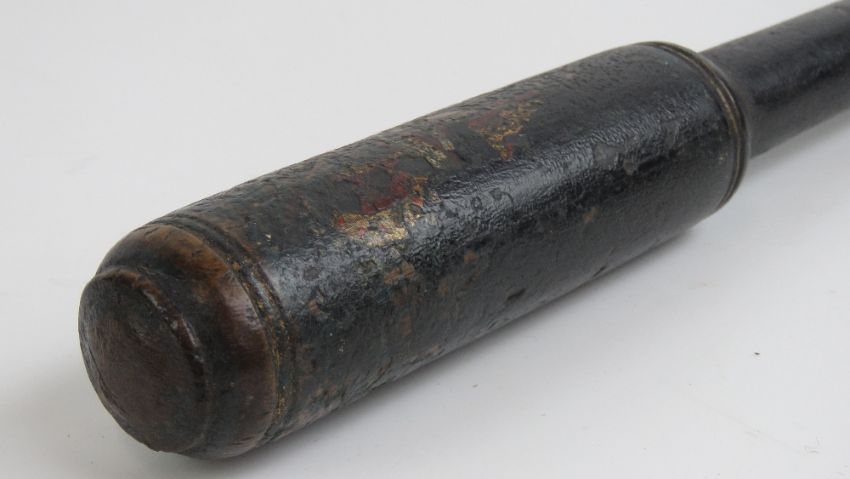 A Victorian truncheon having black ground throughout showing traces of paint for crown with VR cypher under, plain grip with drilled hole for wrist loop, all in original and unrestored condition,33.5cm in length.