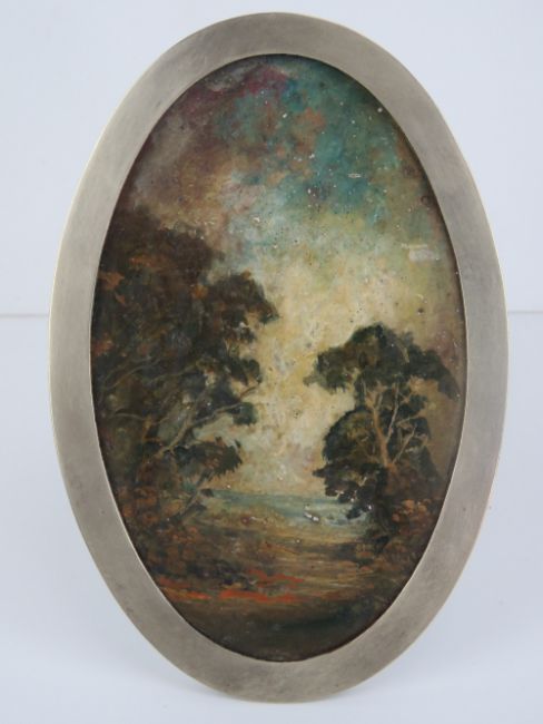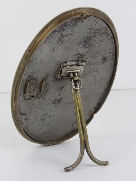 Cabinet oval portrait easel frame: an oval oil on paper in a steel framed (cabinet sized) easel frame, able to take 5 1/2 x 3 1/2" (14 x 9cm).