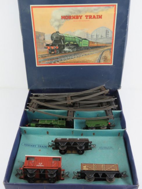 A Hornby train passenger set 0 gauge number 601 Goods Set comprising clockwork locomotive three carriages and track, within original box.