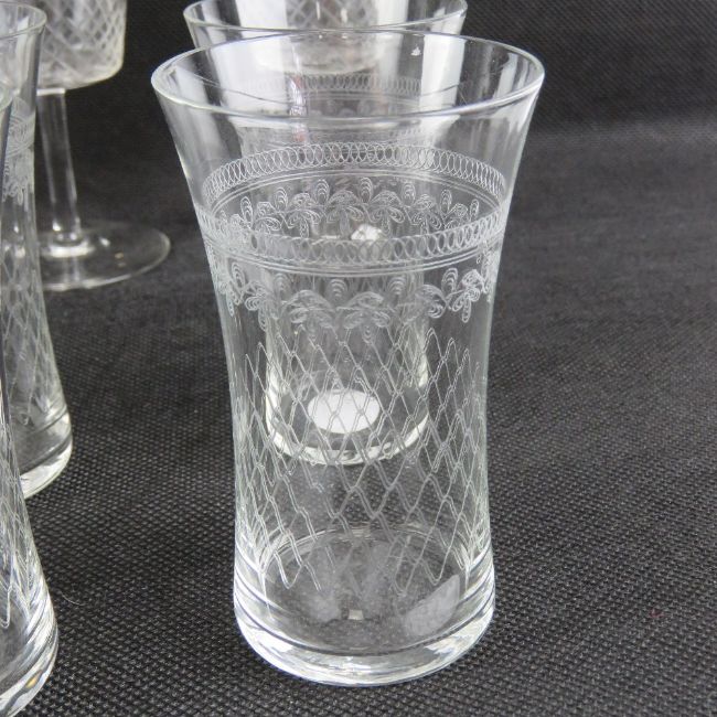 A quantity of Edwardian glassware being six small tumblers, six sherry glasses, six small wine pall mall, six champagne pall mall, and four pall mall.