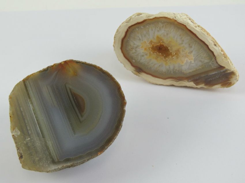 Two geodes being a blue banded agate 6cm wide, and a brown druzy crystal, 9 x 5cm.